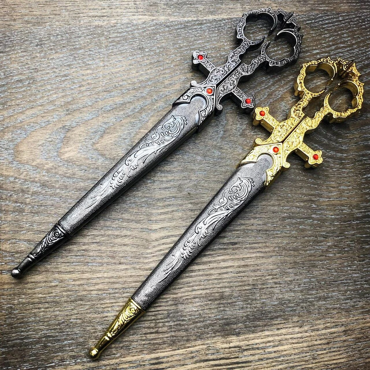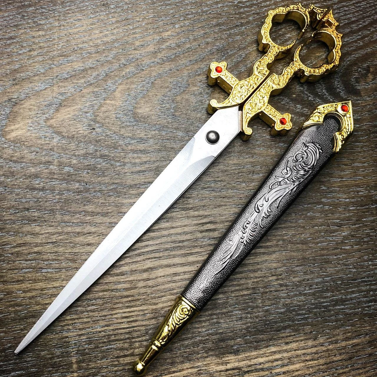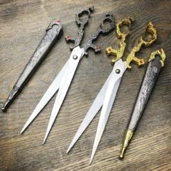 This is a 14th Century Style Renaissance Bodice Scissor Replica. A beautiful decorative piece and fully functional for use. Scissors’ overall length is at 10″, constructed by 440 stainless steel, and come with a sheath to cover the blades.