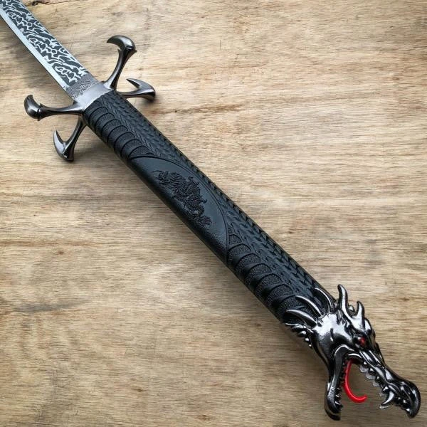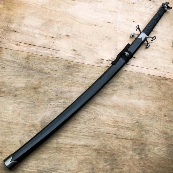 The Black Dragon Samurai Sword with Dragon Claw Guard is the perfect piece for any sword enthusiast. It features a black carved dragon scale imitation handle and a dragon symbol on the handle, with a detailed dragon head as the pommel with a dragon claw hand guard, this sword is ready to impress.