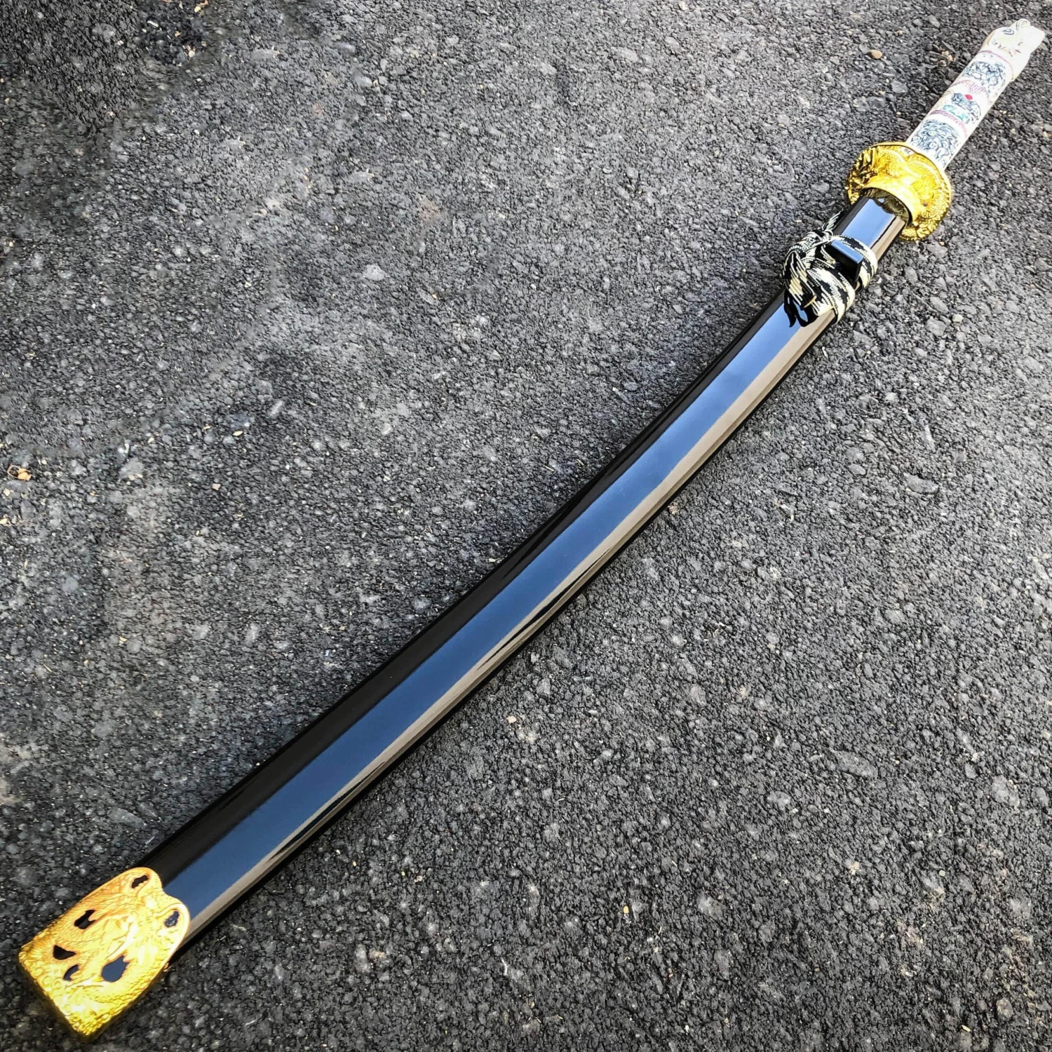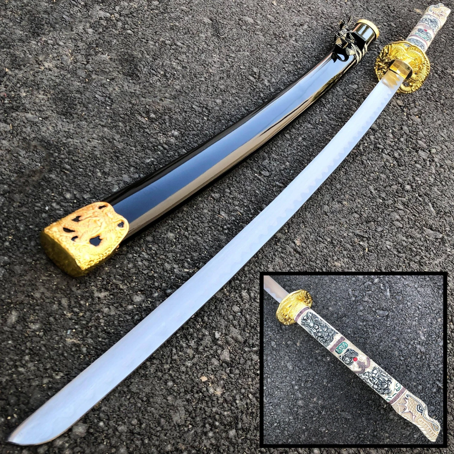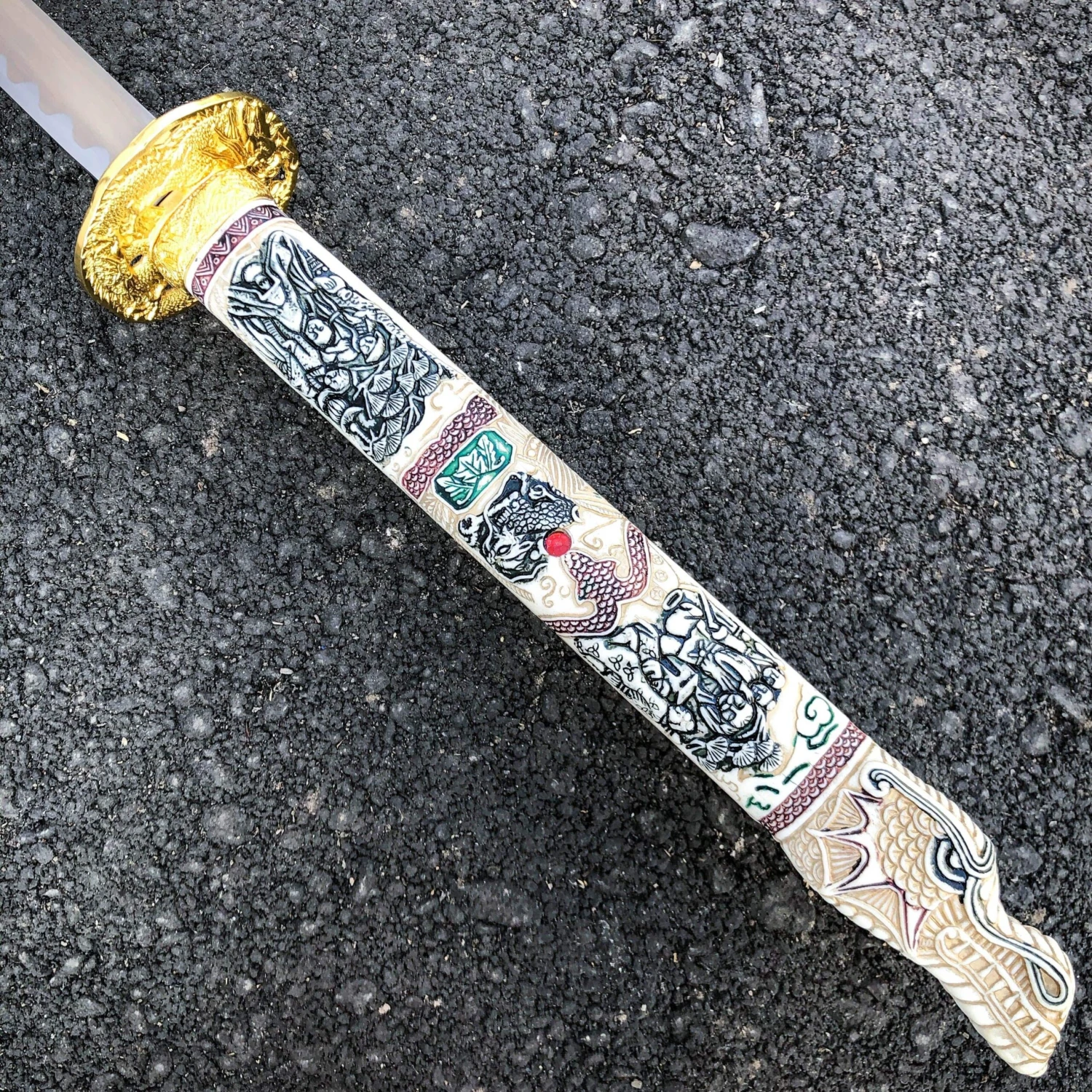 - The Highlanders would definitely be proud of this amazing Sword of the Dragon Katana. It features an intricately detailed faux ivory handle which resembles a hand carved, antique katana. A 26″ carbon steel blade will certainly be intimidating to your guests!