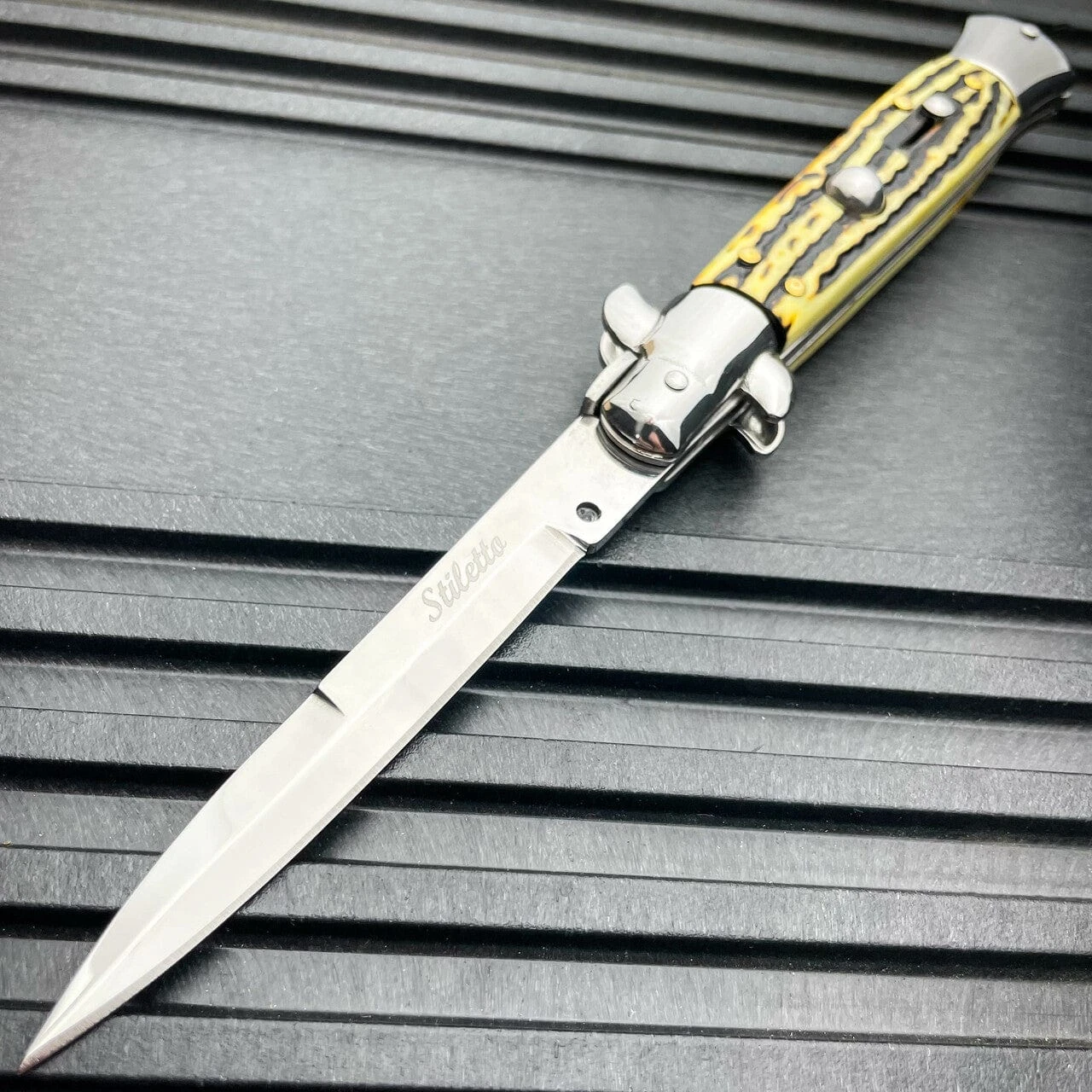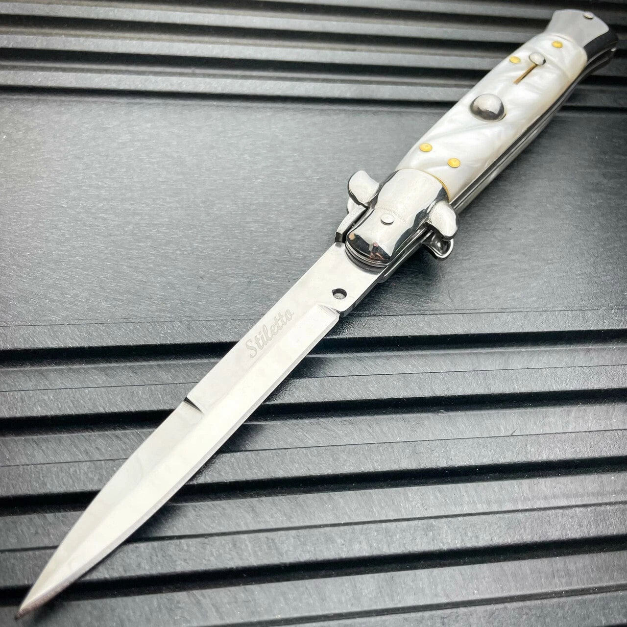 The Italian stiletto is one of the most iconic knives in history due to its long history and time-tested style. This stiletto has an integrated vertical slide safety, push-button operating system, and the blade is released by pushing the front-most wing guard from right to left (View Photos). Beautiful pocket knife with stainless steel bolsters, a single edged bayonet style blade.