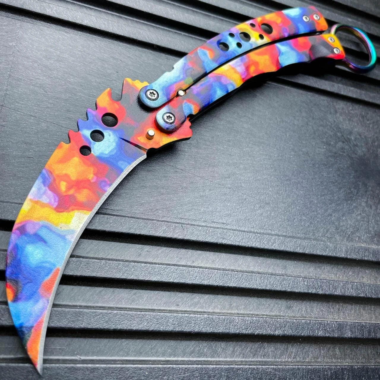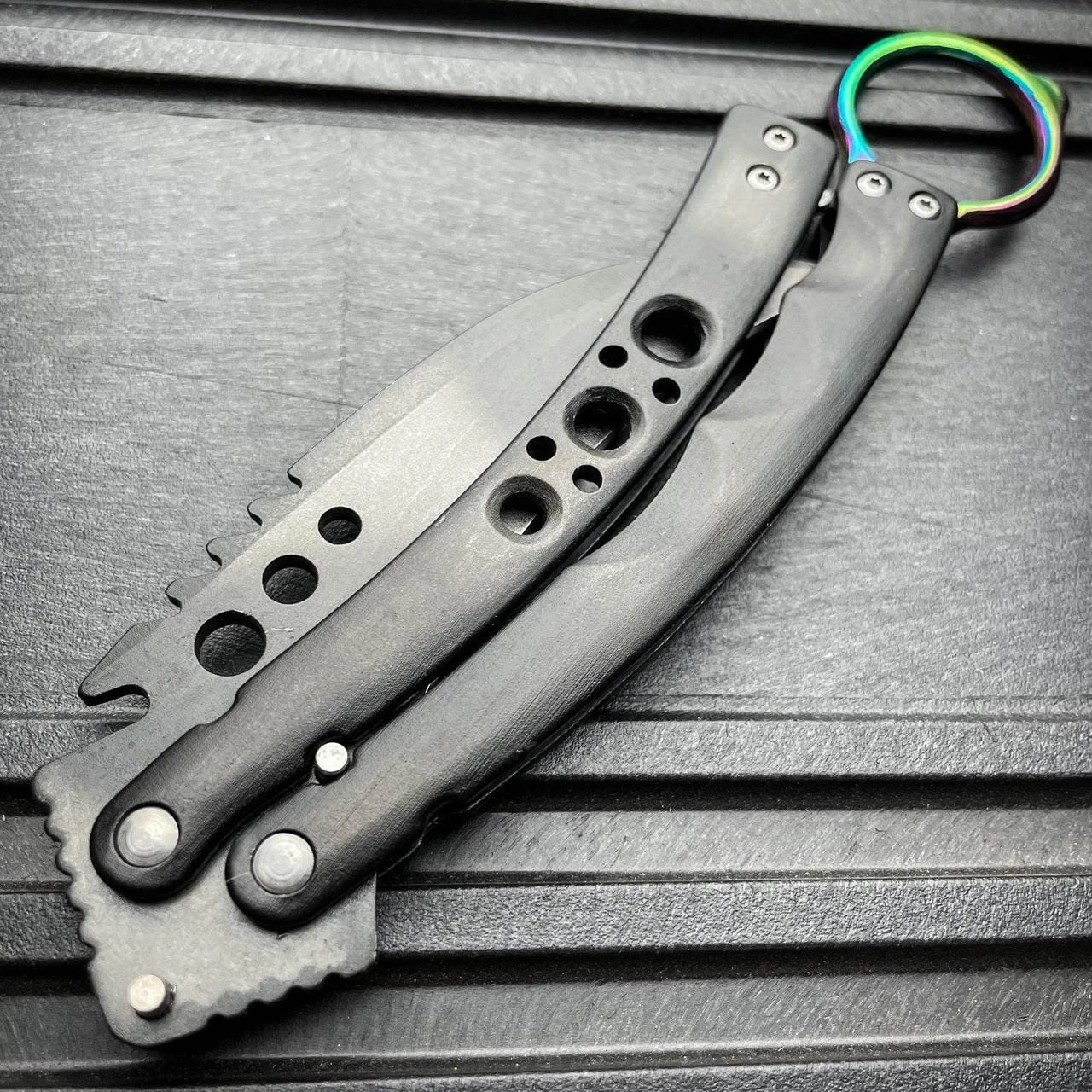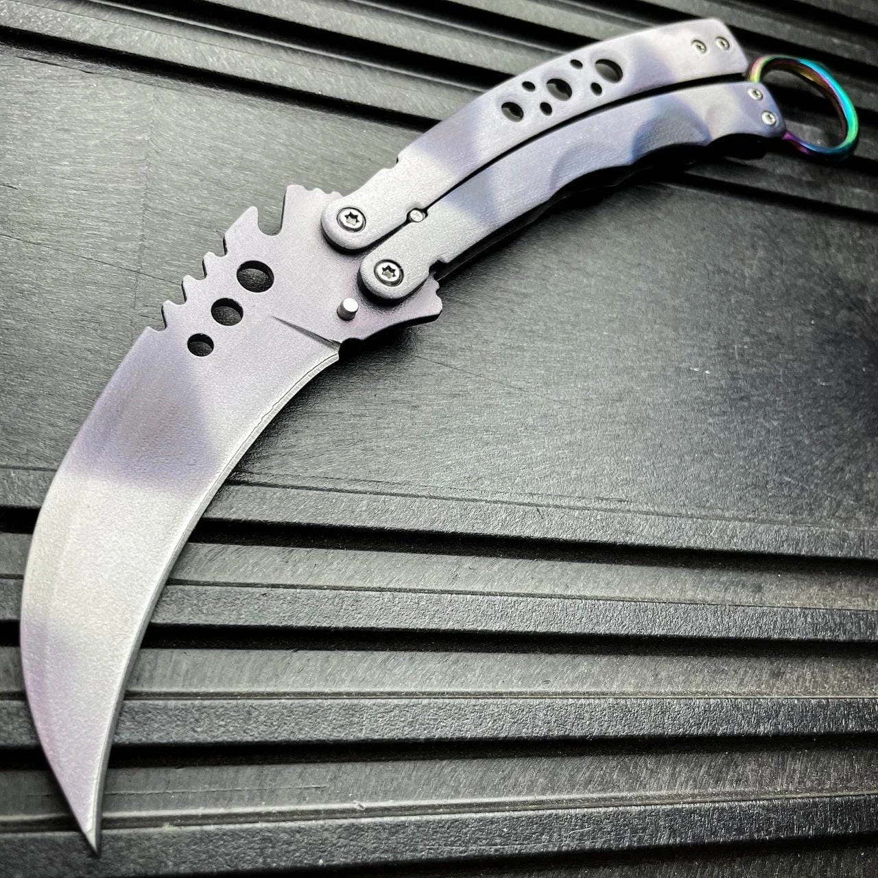 Sleek and well balanced. This one of a kind mixture of a butterfly knife with a karambit style blade is guaranteed not to disappoint. This exclusive design you won’t find anywhere else and is sure to sell out fast. Limited quantities available.