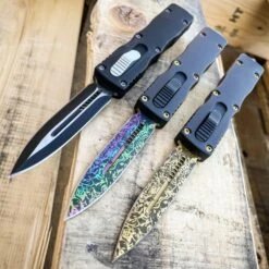 The Diplo OTF Series is a smooth double action assisted pocket knife with a beautiful Zinc Aluminum handles. Pushing forward on the middle out button deploys the blade out the front of the handle and pulling backwards on the button retracts the blade back into the handle where it awaits to be deployed again in a moments notice.