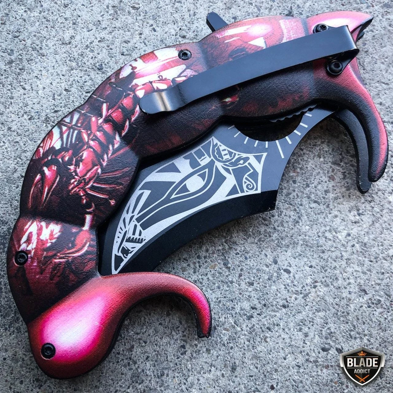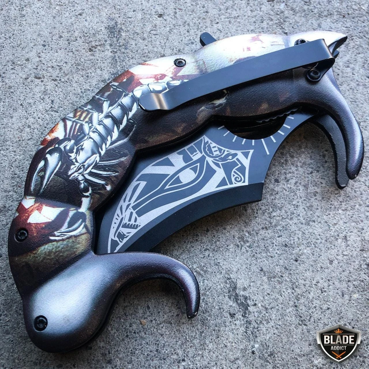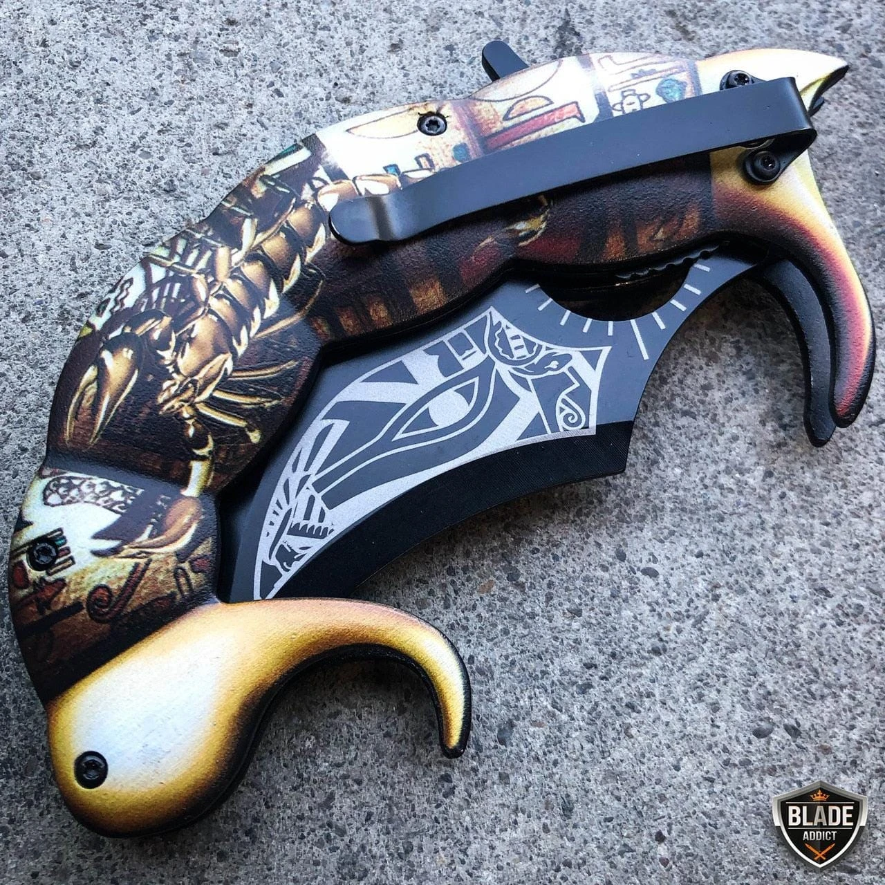 This fantasy pocket knife feels like a beast in your hand! Massive 8.5″ when it’s open and a solid, beefy construction. Add this to your collection or carry it everyday to show off. It can be quickly deployed with the spring assisted opening mechanism, using the flipper.