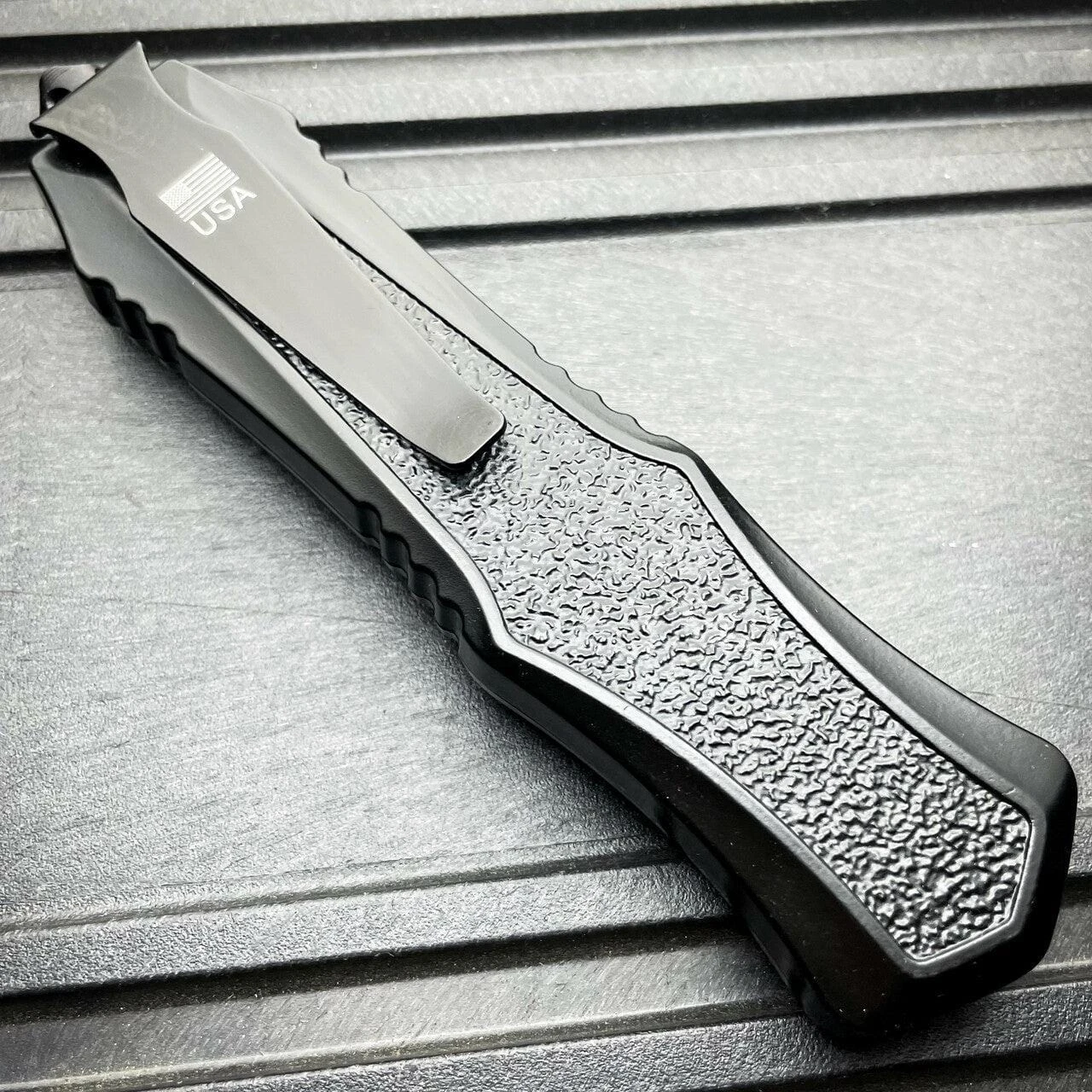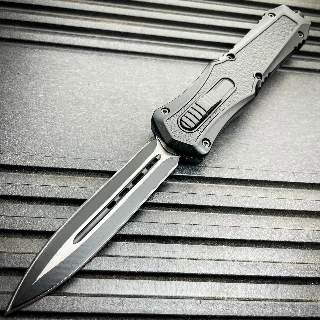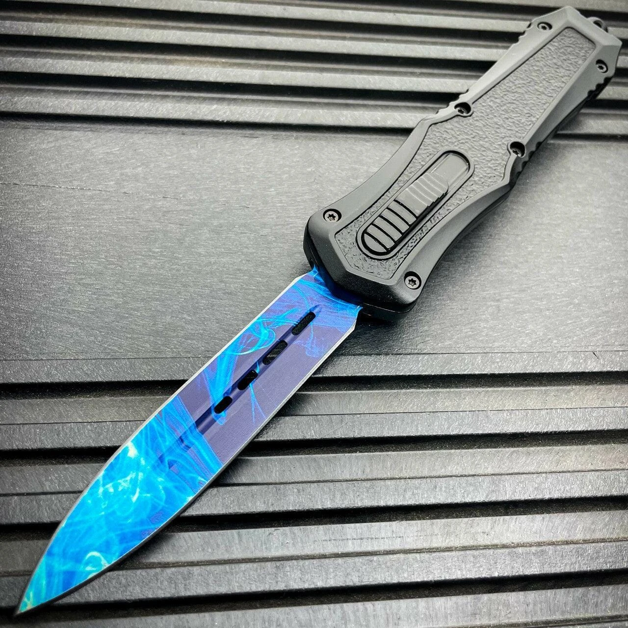 The Mortar OTF received its name from how fast the blade can be quickly deployed with the ambidextrous sliding button, located on the face of the handles. Pushing forward on the button deploys the blade out the front of the handle and pulling backwards on the button retracts the blade back into the handle where it awaits to be deployed again in a moments notice. The Zinc-Aluminum handle is coated with a metallic finish and patterned grip for slip resistant handling in any environment. The metal pocket clip is reversible making our knife ambidextrous. When clipped into your pocket our otf knives are so slim it easily becomes neatly concealed. The end of our knife features a tactical glass breaking tail-cap designed to shatter glass in case of an emergency.