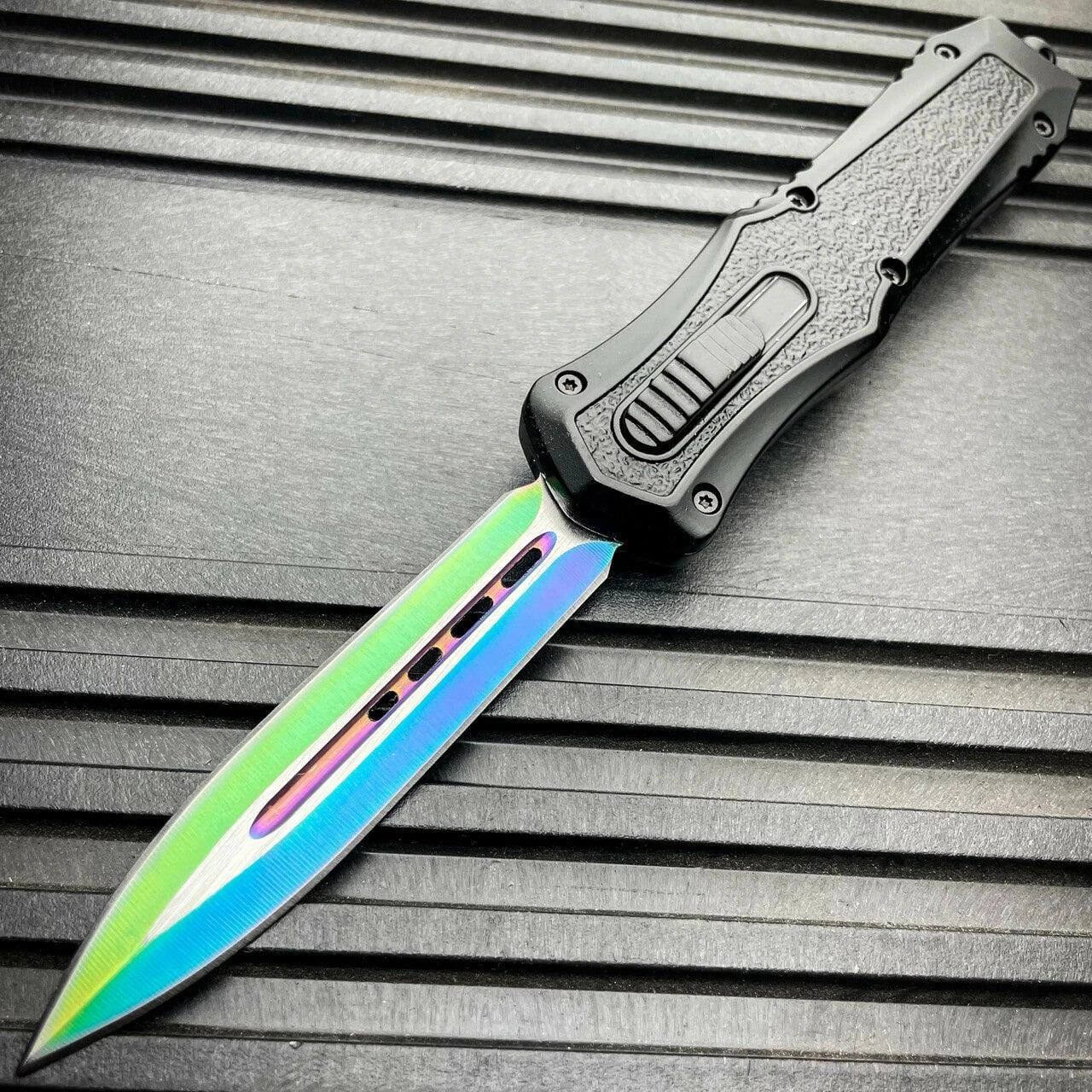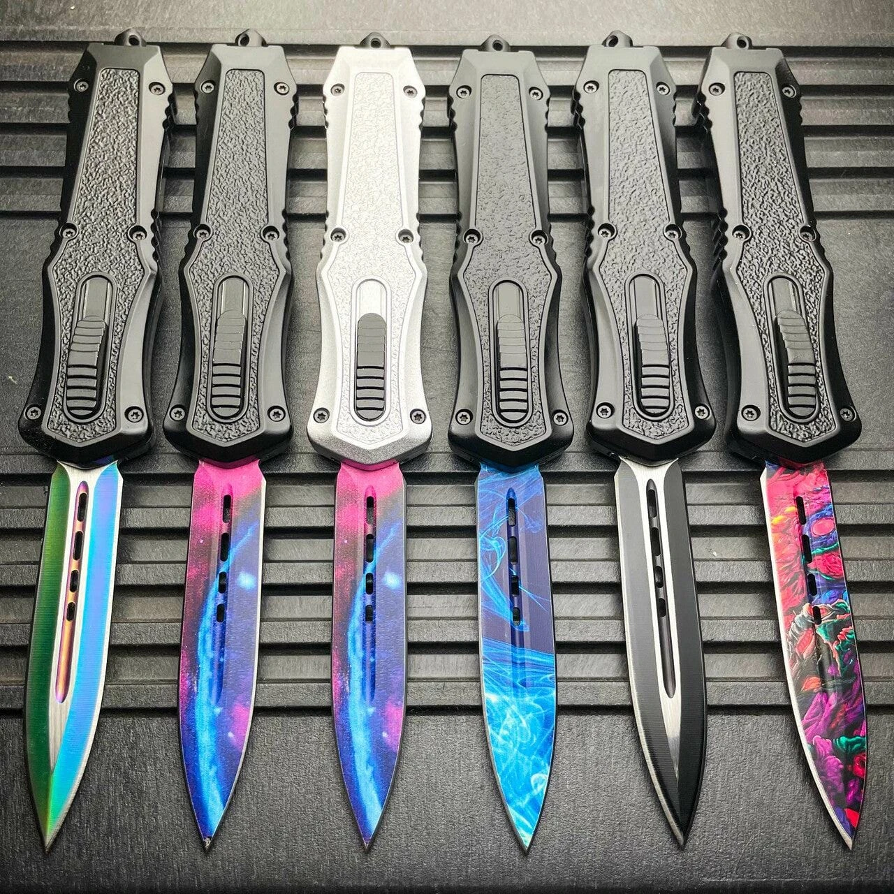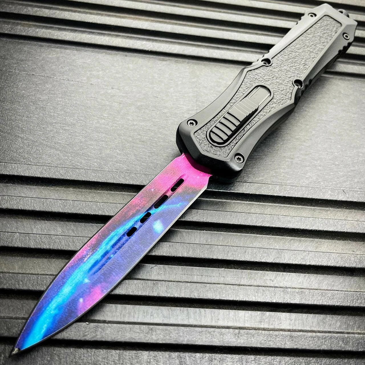 The Mortar OTF received its name from how fast the blade can be quickly deployed with the ambidextrous sliding button, located on the face of the handles. Pushing forward on the button deploys the blade out the front of the handle and pulling backwards on the button retracts the blade back into the handle where it awaits to be deployed again in a moments notice. The Zinc-Aluminum handle is coated with a metallic finish and patterned grip for slip resistant handling in any environment. The metal pocket clip is reversible making our knife ambidextrous. When clipped into your pocket our otf knives are so slim it easily becomes neatly concealed. The end of our knife features a tactical glass breaking tail-cap designed to shatter glass in case of an emergency.