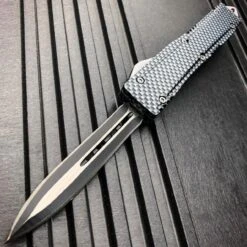 Schrade’s Viper OTF packs a lot of punch into a small amount of space. The double edged, black finish blade is made of 4034 stainless steel and has a scalloped design to the edge along with the Viper logo embossed in the middle. The aluminum handle has geometric designs to assist with grip and keep the knife from feeling too bulky or heavy in the hand. There is a sliding safety mechanism to prevent the blade from opening accidentally, and a glass breaker tip on the end of the handle makes this a great tool to keep in a car or 72-Hour kit.