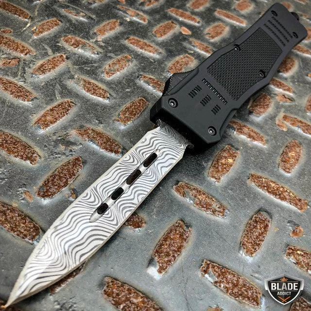 The Damascus double action OTF knife is perfect for those who want a knife to carry without the extra bulk.