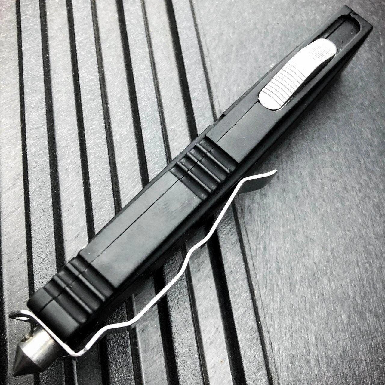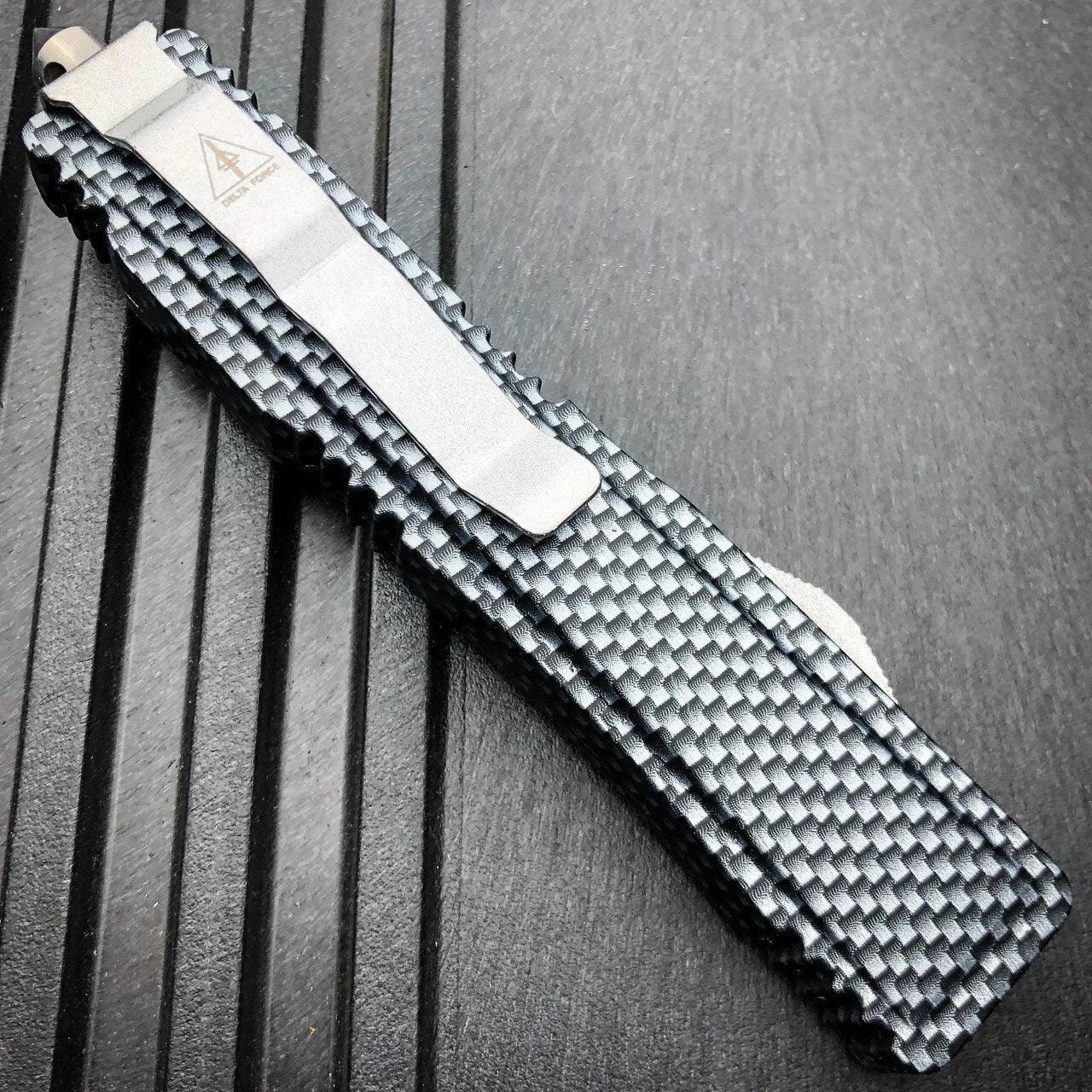 The DELTA OTF is a quick and easy to use double-action OTF knife. The side mounted button is pushed to release the blade and pulled back for closing. The handle includes a pocket clip with glass breaker stub for those emergency situations. The two-tone finished stainless steel dagger blade is double edge. Good quality and reliable!